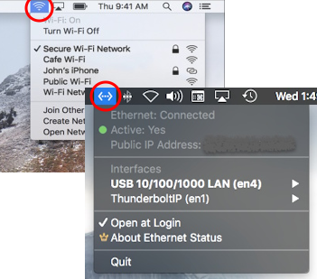 For Mac users, check the dock on the top of your screen. You will see a Wi-Fi symbol or a <…> symbol depending on your type of connection.