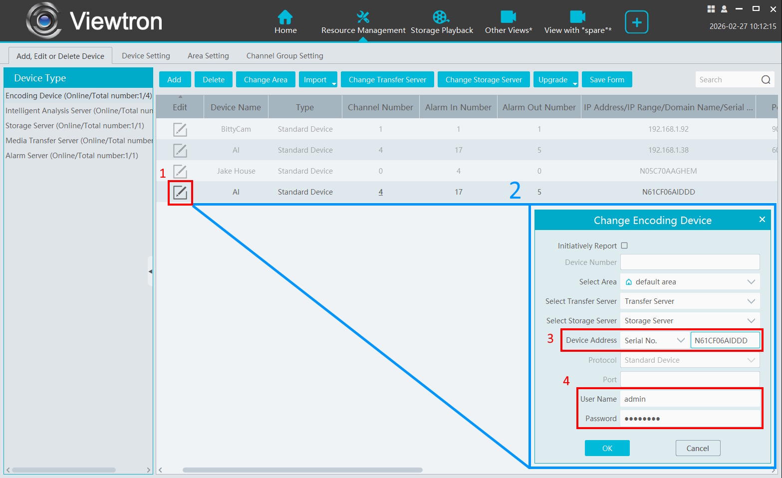 Make sure that you have entered your credentials correctly. In the Resource Management tab of the VMS Software, Edit (1) your device settings and make sure that the Serial Number (3) and User/password (4) are correct.