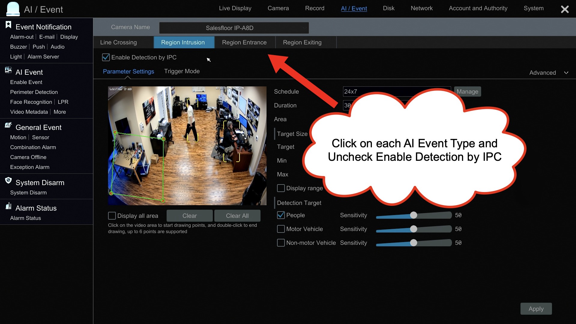 2. Select each of the AI detection types and uncheck the “Enable Detection by IPC” check box for each type that you are not using. E.G. Line Crossing, Region Intrusion, Region Entrance, Region Exiting