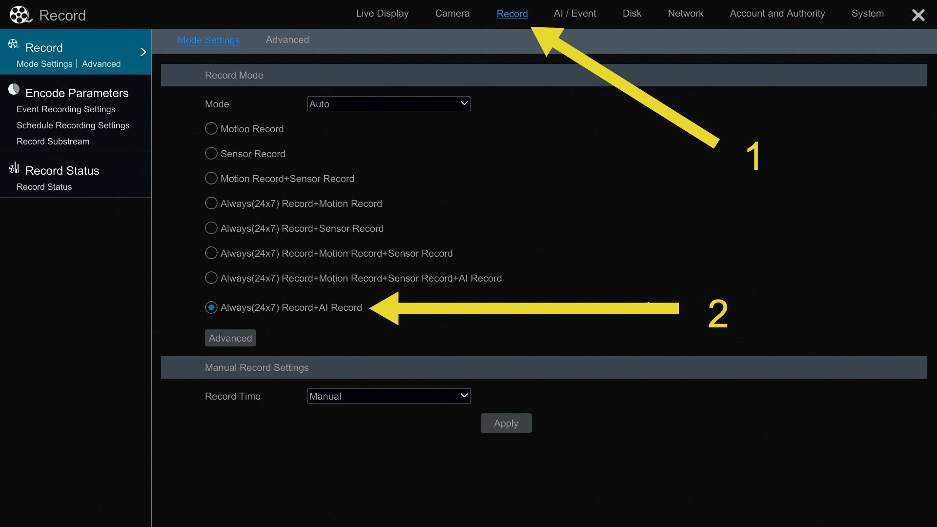For Viewtron AI security camera systems, I usually recommend to setup a custom recording configuration that consists of Always (24 x 7) Recording + AI Record. This give you continuous recording but also bookmarks all of the AI detection events. This way you never miss any recording but it is easy to locate the human detection and / or vehicle detection events on your system. If you are using LPR cameras and face recognition cameras, those AI events will also all be bookmarked.
