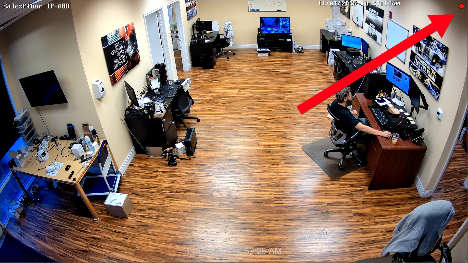 Now, when the panic button is pressed, our Salesfloor camera pops up into view on the NVR and a red dot is displayed in the upper right which means that Sensor recording was triggered. The NVRs internal alarm buzzer is turned on.