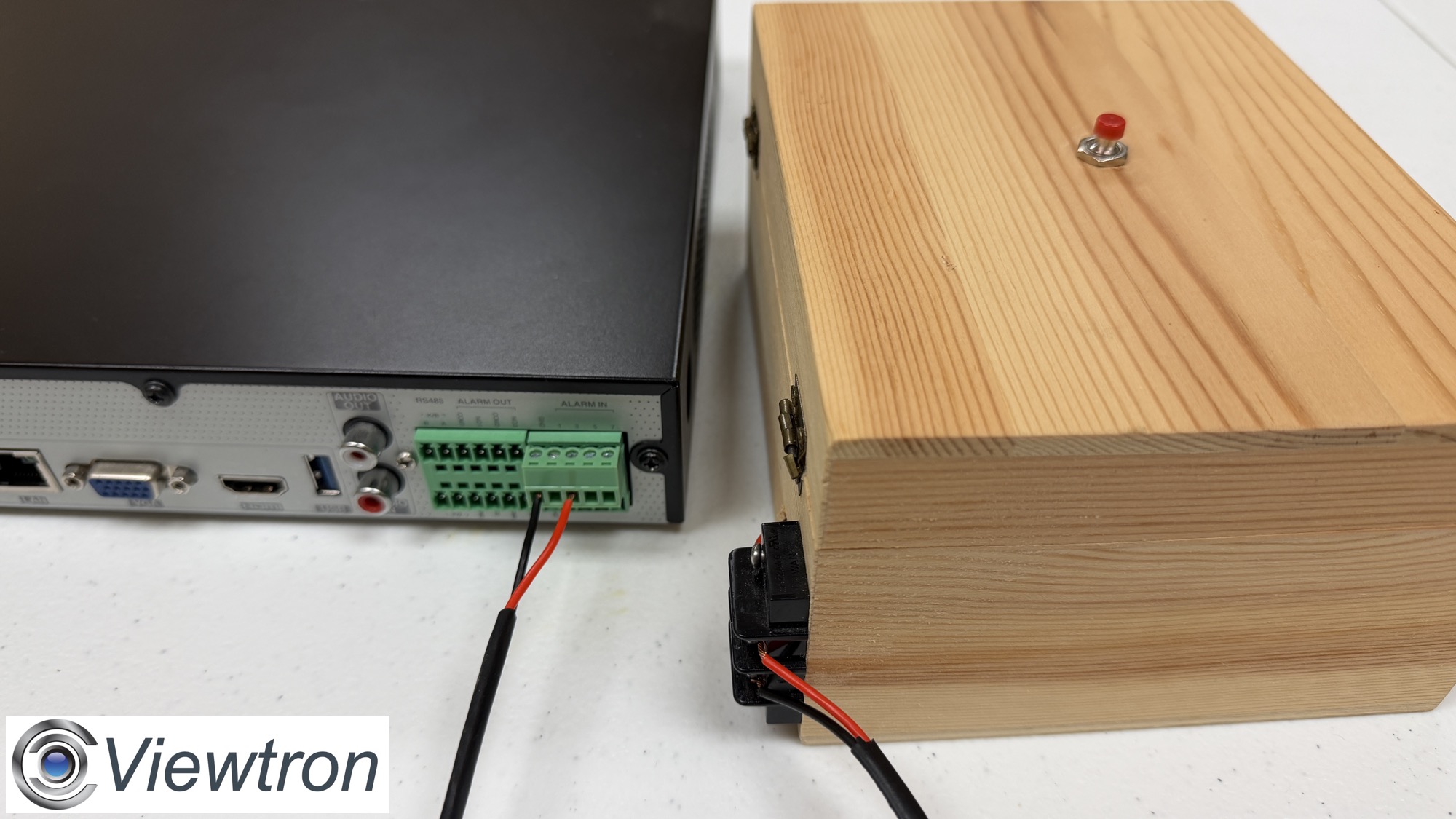I mounted a simple 2-pin push button to the top of this wooden box. The push buttons two wires are hard wired to the Ground and alarm input port #3 on the DVR / NVR. The alarm input is a dry contact that can be set to normally open (NO) or normally closed(NC) in the DVRs software. For a push button application, the port will be set to NO.