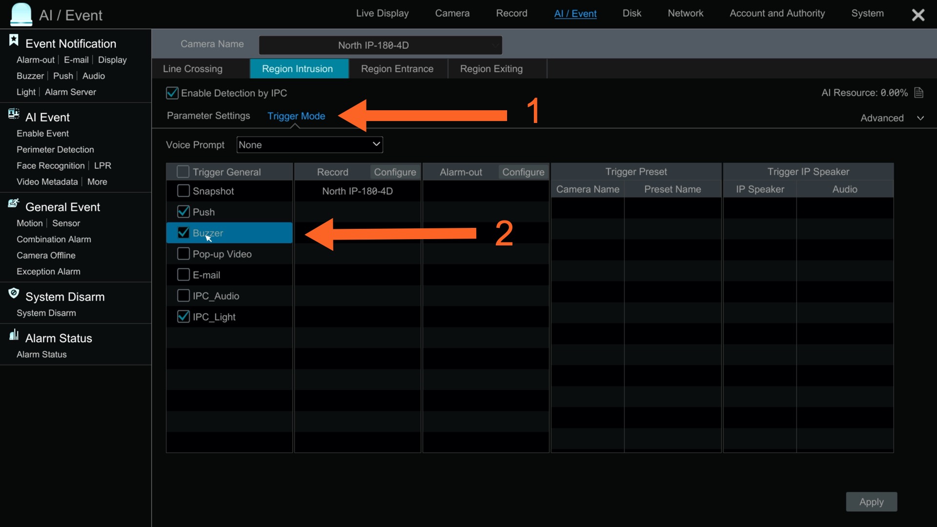 2) To enable the audio speaker alarm / buzzer on the NVR, check the Buzzer checkbox.