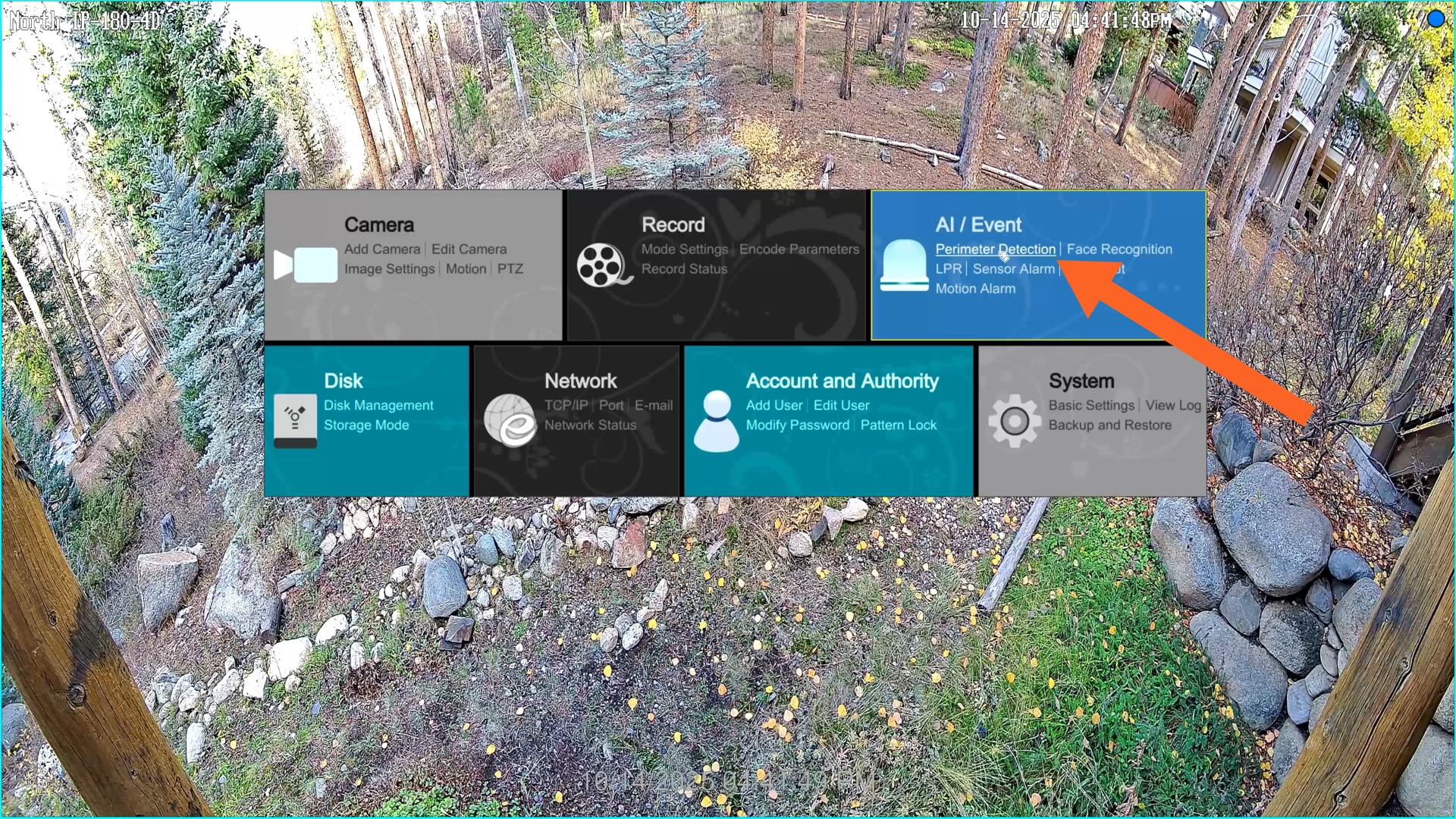 On the main settings menu screen, click on Perimeter Detection in the AI / Event section.