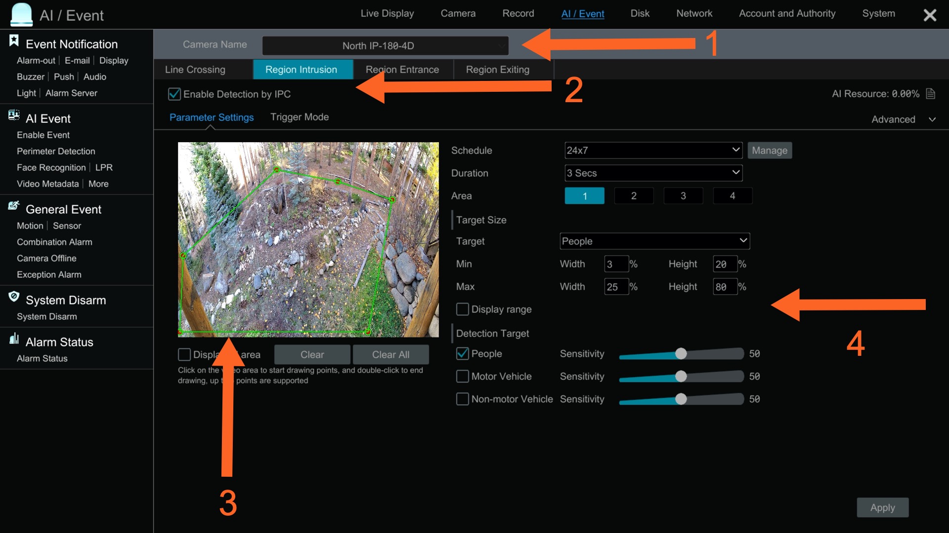 - Choose a schedule for the alarm, duration for the alarm, and whether you want the AI software to detection humans, motor vehicles, non-motor vehicles, or any combination of those three object types. You can also setup minimum and maximum sizes for each object type to make the detection more accurate.