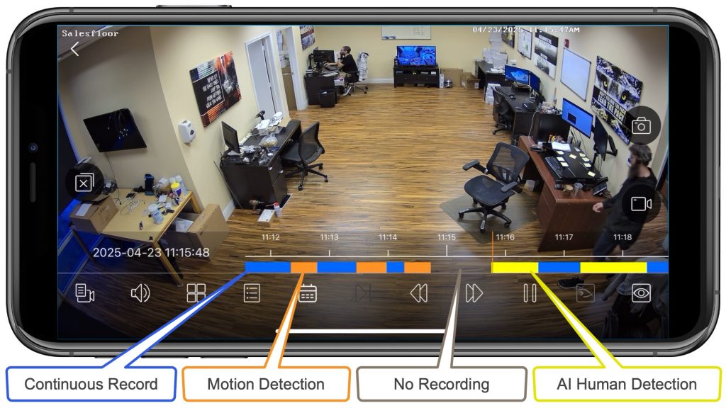 When you are playing back video in the app, you will notice that the video timeline is annotated in sections with different colors. This makes it easy to locate specific types of recordings and alarm events. Referring to the above screenshot you will notice the following annotations on the timeline.