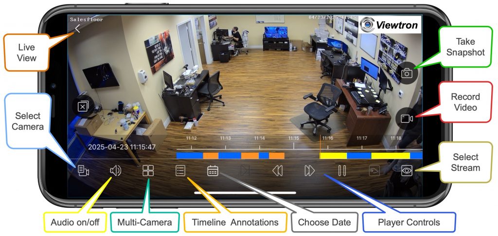 Here is a video demo using the Viewtron security camera app to playback recorded video surveillance footage on a Viewtron DVR / NVR. This mobile app is available for iPhone and Android phones. You can find links to download all Viewtron security camera apps here.