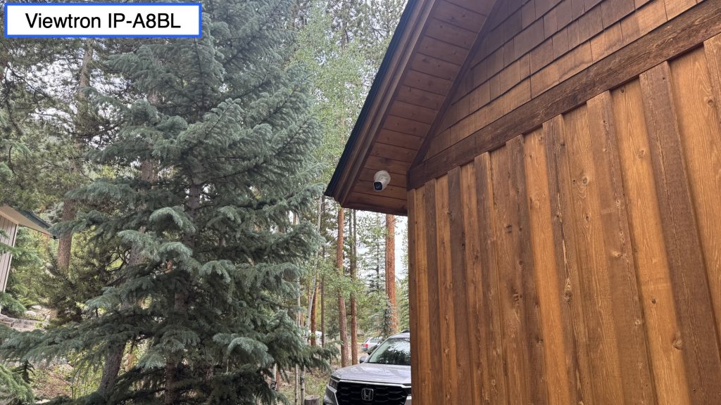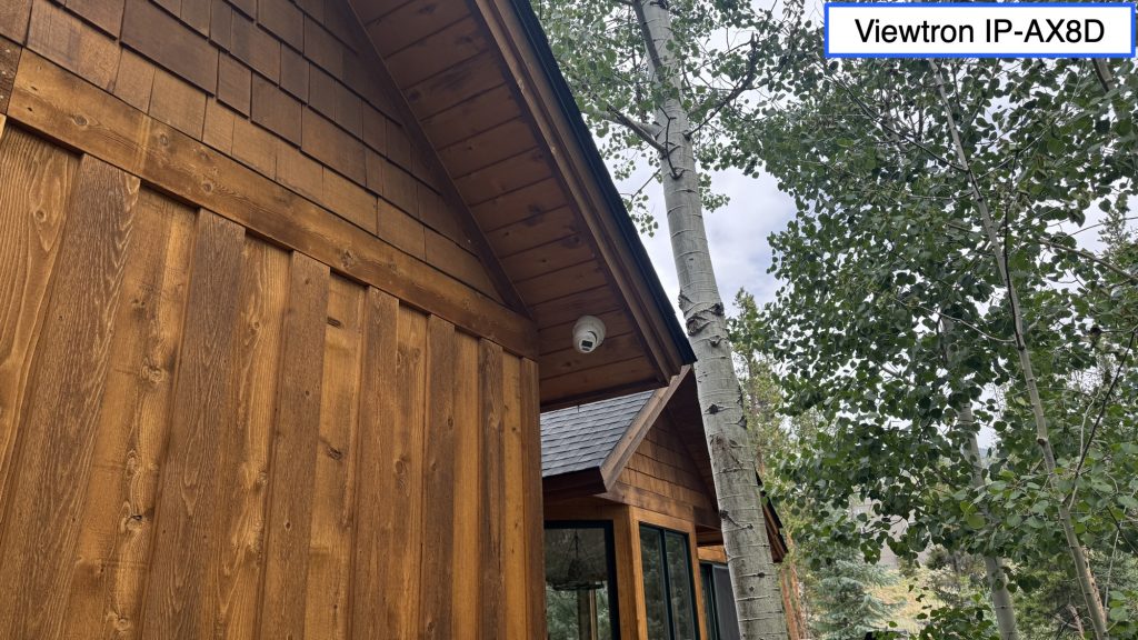 Here is the location of the Viewtron IP-A8BL that is installed on that same side of the house, but facing the opposite direction. Viewtron bullet-style and dome-style cameras mount neatly on the underside of roof eaves using the optional junction box. The bullet cameras are extremely easy to point in the direction that you want them to monitor. This 4K bullet IP camera has built-in AI software for human detection, vehicle detection, and facial recognition / face detection.